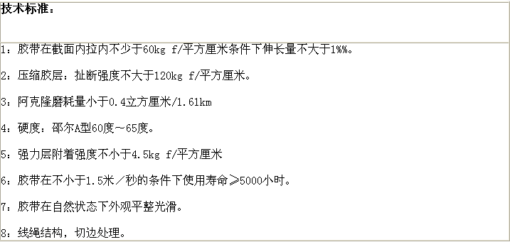 1:膠帶在截面內拉內不少于60kg f/平方厘米條件下伸長(cháng)量不大于1%%。 2:壓縮膠層:扯斷強度不大于120kg f/平方厘米。 3:阿克隆磨耗量小于0.4立方厘米/1.61km 4:硬度:邵爾A型60度~65度。 5:強力層附著(zhù)強度不小于4.5kg f/平方厘米 6:膠帶在不小于1.5米/秒的條件下使用壽命≥5000小時(shí)。 7:膠帶在自然狀態(tài)下外觀(guān)平整光滑。 8:線(xiàn)繩結構,切邊處理。 |